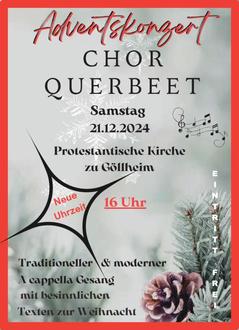 Und wieder ist es soweit. Das alljährliche Adventskonzert des Chors Querbeet unter der Leitung von Annette Probst steht vor der Tür. Am Samstag, den 21. Dezember 2024 um 16.00 wird der Chor Querbeet in der protestantischen Kirche zu Göllheim mit seinem A cappella Gesang wieder seine Zuhörer bezaubern. Es werden traditionelle Weisen wie auch modernes Liedgut zu Gehör gebracht. Umrahmt werden die musikalischen Leckerbissen mit besinnlichen Texten, ebenfalls vorgetragen von den SängerInnen des Chors. Genießen Sie eine Stunde Auszeit von der Hektik der Weihnachtszeit, eine Stunde nur für SIE. Der Eintritt ist frei.