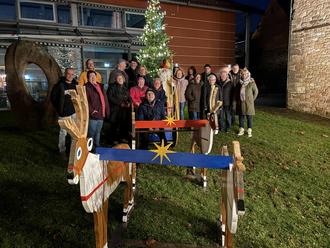 Am zweiten Adventswochenende zogen dann die Pyramide und der neu entstandene Rentierschlitten, den Reinhold Beyer, Dieter Magsamen und Bruno Weygand in diesem Jahr gebaut haben, an den Gaulstall weiter, wo Maria, Josef und das Jesuskind in ihrer Krippe schon auf sie warteten. Zum Umzug der Figurengruppe lud die Ortsgemeinde Göllheim ein, der Freundeskreis bewirtete die interessierten Gäste. Und natürlich kam, wie sollte es am Nikolaustag anders sein, erneut der Nikolaus zur Feierstunde.