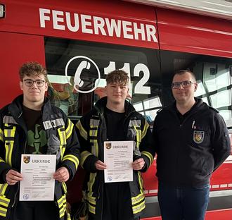 v.l.n.r. Jöran Karp und Sebastian Kohl Feuerwehreinheit Dreisen, Manuel Fischer stv. Wehrleiter VG Göllheim