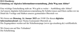 Wir bieten am Dienstag, 14. Januar 2025 um 19:00 Uhr diesen digitalen Informationsabend zum Thema Gymnasiale Oberstufe an.