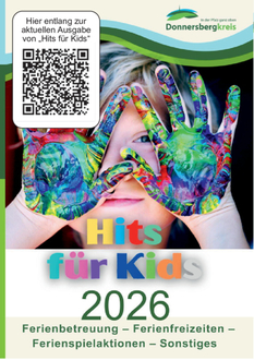 Anfang März – der Frühling ist im Anmarsch und die Jahresplanungen von Familien im Donnersbergkreis sind in vollem Gang. Hier unterstützt der Ferienplaner des Jugendamts, „Hits für Kids 2026“. „Hits für Kids“ gibt einen Überblick über vielfältige Ferienbetreuungsangebote, Ferienfreizeiten und Ferienspielaktionen sowie die Angebote der offenen Kinder- und Jugendarbeit im Donnersbergkreis. Flyer und Poster zu „Hits für Kids“ gibt es an diversen Stellen im Kreis, u.a. bei den Verbandsgemeinden und im Kreishaus. Per QR-Code verweisen die Poster und Flyer auf die digitale Ausgabe des Ferienplaners.