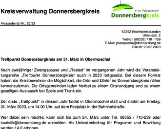 Nach zweijähriger Zwangspause und „Restart“ im vergangenen Jahr wird die Veranstaltungsreihe „Treffpunkt Donnersbergkreis“ auch in 2023 fortgesetzt. Bei diesem Format haben die Kreisbewohner die Möglichkeit, die Orte und Dörfer im Donnersbergkreis näher kennenzulernen. Die Ortsgemeinden laden hierbei zu einem Ortsrundgang und zu einem geselligen Austausch bei Speis und Trank ein. Der erste „Treffpunkt“ in diesem Jahr findet in Obermoschel statt und startet am Freitag, 31. März 2023, um 14.00 Uhr, auf dem Festplatz in der Bahnhofstraße. Wer dabei sein möchte, kann sich bis zum 24. März unter Tel. 06352 / 710-239 oder touristik@donnersberg.de anmelden. Als Unkostenbeitrag für Programm und Bewirtung werden 14 € erhoben.