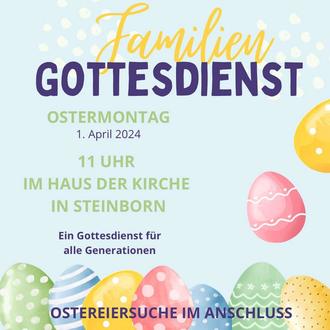 Am Ostermontag, dem 01. April 2024, findet im Haus der Kirche in Steinborn ein Familien-Gottesdienst statt. Der Gottesdienst für alle Generationen beginnt um 11:00 Uhr. Im Anschluss gibt es eine Ostereiersuche für die Kinder.