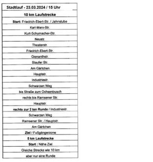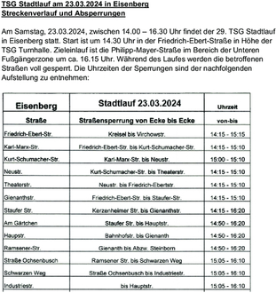 Am Samstag, 23.03.2024, zwischen 14.00 – 16.30 Uhr findet der 29. TSG Stadtlauf in Eisenberg statt. Start ist um 14.30 Uhr in der Friedrich-Ebert-Straße in Höhe der TSG Turnhalle. Zieleinlauf ist die Philipp-Mayer-Straße im Bereich der Unteren Fußgängerzone um ca. 16.15 Uhr. Während des Laufes werden die betroffenen Straßen voll gesperrt. Die Uhrzeiten der Sperrungen sind der nachfolgenden Aufstellung zu entnehmen: