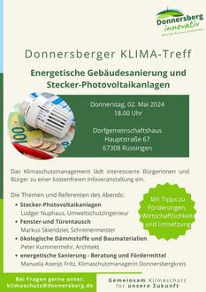 Mit dem Donnersberger Klimatreff im Dorfgemeinschaftshaus von Rüssingen bietet das Klimaschutzmanagement der Kreisverwaltung Donnersbergkreis einen Infoabend rund um das Thema energetische Gebäudesanierung und Stecker-Photovoltaikanlagen an.