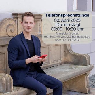 Der Bundestagsabgeordnete Matthias Mieves (SPD) bietet am Donnerstag, den 03. April, von 09:00 bis 10:30 Uhr seine Telefonsprechstunde an. Interessierte Bürgerinnen und Bürger aus seinem Wahlkreis können mit ihm über ihre Anliegen sprechen. Anmeldungen erfolgen unter matthias.mieves.wk@bundestag.de oder unter 0151 10377531.