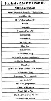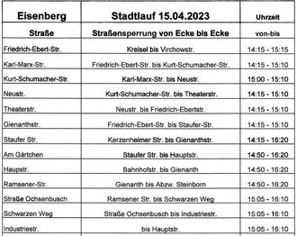 Am Samstag, 15.04.2023, zwischen 14.00 - 16.30 Uhr findet der 28. TSG Stadtlauf in Eisenberg statt. Start ist um 14.30 Uhr in der Friedrich-Ebert-Straße in Höhe der TSG Turnhalle. Zieleinlauf ist die Philipp-Mayer-Straße im Bereich der Unteren Fußgängerzone um ca. 16.15 Uhr. Während des Laufes werden die betroffenen Straßen voll gesperrt. Die Uhrzeiten der Sperrungen sind der nachfolgenden Aufstellung zu entnehmen: