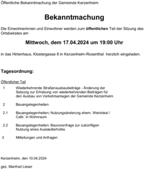 Die Einwohnerinnen und Einwohner werden zum öffentlichen Teil der Sitzung des Ortsbeirates am Mittwoch, dem 17.04.2024 um 19:00 Uhr in das Hirtenhaus, Klostergasse 8 in Kerzenheim-Rosenthal herzlich eingeladen.