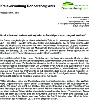 Landrat Rainer Guth äußert dazu: „Die Kultur, und hier besonders auch die Musik, ist einer der Bausteine, die uns im Donnersbergkreis zusammenhalten und auf die wir unsere Gemeinschaft aufbauen. Zahlreiche Musikvereine im Kreis leisten hervorragende Arbeit, die Kreismusikschule bildet Generation um Generation von Kindern und Jugendlichen in den musischen Künsten aus. Und immer wieder ist es eine Freude, wenn Kinder und Jugendliche aus dem Kreis ihre Instrumente so gut bespielen, dass sie bei ‚Jugend musiziert‘ Erfolge feiern. Aufgrund der Corona-Krise konnten wir die Preisträgerinnen und Preisträger lange nicht gebührend würdigen. Das holen wir nun nach.“
