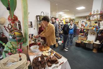 Das Verkäufer*innen-Team bereitet verschiedene Leckereien aus fair gehandelten Produkten vor.