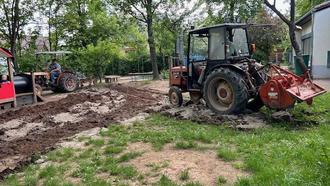 Alle Anwesenden bearbeiteten tatkräftig den Boden. Dieser wurde tiefengrund gelockert und fein abgefräst, um mit Rechen und Schaufeln den Boden zu glätten. Mit Sand aufgelockert und geebnet konnte der Rasensamen aufgebracht und abgewalzt werden.
