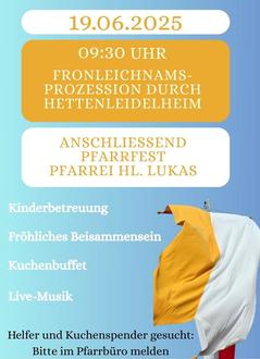 | • | Am 19.06.2025 feiern wir die Eucharistiefeier mit anschließender Fronleichnamsprozession in Hettenleidelheim. Im Anschluss daran freuen wir uns über zahlreiche Besucher des Pfarrfestes. Für Kinderbetreuung ist gesorgt. Wir suchen noch fleißige Helfer und Kuchenspender. Wer uns unterstützen möchte, kann sich gerne im Pfarrbüro melden. |