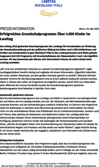 Das Anfang 2018 gestartete Besuchsprogramm des Landtags für Grundschulen zur Förderung der Demokratieerziehung und der politischen Bildung hat bisher rund 4.300 Schülerinnen und Schüler aus Grundschulen in ganz Rheinland-Pfalz in das Landesparlament nach Mainz gelockt.