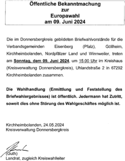 Die im Donnersbergkreis gebildeten Briefwahlvorstände für die Verbandsgemeinden Eisenberg (Pfalz), Göllheim, Kirchheimbolanden, Nordpfälzer Land und Winnweiler, treten am Sonntag, dem 09. Juni 2024, um 15.00 Uhr im Kreishaus (Kreisverwaltung Donnersbergkreis), Uhlandstraße 2 in 67292 Kirchheimbolanden zusammen.