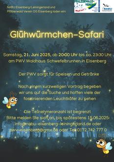 Der NABU Eisenberg/Leiningerland und der PWV-Eisenberg veranstalten am 21.06.2025 eine Glühwürmchen-Safari.