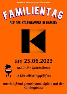 Der Bezirksverband der Kolpingsfamilie Grünstadt-Frankenthal lädt am Sonntag, 25. Juni 2023 zum Familientag bei der Kolpingsfamilie Ramsen ein. Das Fest beginnt um 10:30 Uhr mit einem gemeinsamen Gottesdienst auf der Kolpingswiese, ab 12 Uhr wird dann beim Mitbringgrillfest gemeinsam gegessen und getrunken und im Anschluss ist Zeit für gemeinsame Spiele.