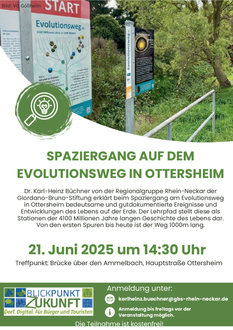 Die Regionalgruppe Rhein-Neckar der Giordano-Bruno-Stiftung und die Verbandsgemeinde Göllheim lädt zu einem besonderen Spaziergang auf dem Evolutionsweg in Ottersheim ein.