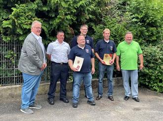 von links: Bürgermeister Bernd Frey, Wehrleiter Michael Partsch, Christoph Gönnewig, Simon Lischewski, Christoph Baldauf, Kreisbeigeordneter Ernst-Ludwig Huy