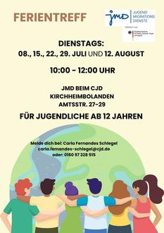| • | Ferientreff für Jugendliche: In den Sommerferien sind junge Menschen ab 12 Jahren dienstags von 10:00 bis 12:00 Uhr eingeladen, beim JMD in der Amtsstraße vorbeizuschauen. |