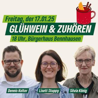 Vor der Bundestagswahl 2025 laden der Grüne Kreisvorstand und die Grüne Kreistagsfraktion zu einem entspannten Austausch mit den Bürgerinnen und Bürgern ein. Am Freitag, den 17. Januar 2025, ab 18:00 Uhr findet im Dorfgemeinschaftshaus Bennhausen die Veranstaltung „Glühwein und Zuhören“ statt.