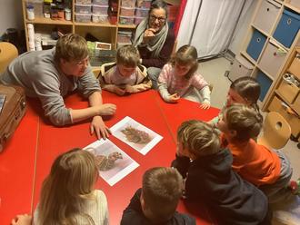 Auf den Bildern sind Kunstwerke zu sehen, die vor allem eines gemeinsam haben: Schnecken, die irgendwie anderes aussehen als die, die im Weinberg umherkriechen, viel bunter und interessanter. Diese Arbeiten, erzählt Annika Treiber den Kindern, stammen von Hermann und Christine Hoormann. Die beiden waren Künstler und hatten ihr Atelier im Hoormann-Haus in Bolanden. Schnecken haben die beiden Künstler immer wieder fasziniert, sie finden sich in vielen Werken der Beiden auf unterschiedliche Art und Weise wieder. Auch ihr Atelier haben sie wegen seiner gewundenen Treppe „Schneckenhaus“ genannt. Inspiriert von den Arbeiten zeichnen die Kinder nun selber: Auf den Skizzenbretten entwerfen sie mit Bleistift auf Papier die abenteuerlichsten Schnecken, den bei einer Skizze ist alles erlaubt. Am Schluss werden die Blätter natürlich noch signiert, so wie bei echten Künstlern. Ehe Kurt und Annika sich verabschieden, laden die beiden die Kinder noch ins Hoormann-Haus ein.