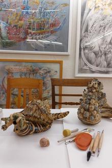 In der Woche darauf ist es dann soweit: Die Stettener Vorschulkinder gehen auf die Reise nach Bolanden. Auch hier wartete Kurt, der Kunstkoffer, wieder auf sie. Diesmal hat er bunte Holzklötze dabei, mit dem jedes Kind bei einem Rundgang durch das Hoormann-Haus sein oder ihr Lieblingsbild markieren darf. Bei der anschließenden gemeinsamen Führung stellt sich heraus, dass den Kindern ganz unterschiedliche Dinge aufgefallen sind und ihnen ganz verschiedene Arbeiten zusagen: manche mögen Farbe und besonders bunte Bilder, anderen gefällt das fliegende Wildschwein, ein Keramik-Tier oder das Schiff mit einem Bug aus Schneckenhäusern. Annika Treiber begleitete die Gruppe, erklärt und berichtet nebenbei immer wieder Kleinigkeiten aus dem Leben von Hermann und Christine Hoormann oder Details zur Kunst.