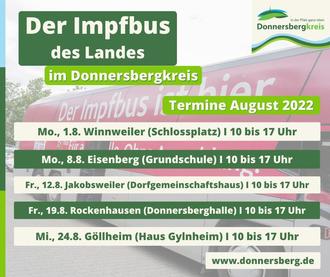 Hier eine Übersicht der Termine des Impfbusses Rheinland-Pfalz im August im Donnersbergkreis: