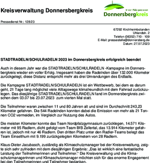 Die Kampagne Stadtradeln/Schulradeln ist ein Wettbewerb, bei dem es darum geht, 21 Tage lang möglichst viele Alltagswege klimafreundlich mit dem Fahrrad zurückzulegen. Das diesjährige Stadtradeln/Schulradeln fand im Donnersbergkreis zwischen dem 03.07 bis 23.07.2023 zum vierten Mal statt.