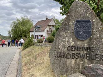 Wer nicht wusste, dass die Lyrikerin Susanne Faschon in Jakobsweiler ebenfalls ein Ferienhäuschen hatte und hier schriftstellerisch tätig war, erfährt es auf einer Gedenktafel. Gestorben ist sie 1995 und wurde auf dem Friedhof im Ort bestattet, der später auch noch Teil der Führung sein sollte. Zunächst aber gab es eine Pause am Kneipp-Becken, das wie mehrere Brunnen von der eigenen Quelle des Orts gespeist wird. Wo früher der Lebensmittelladen war und dass manche Einwohner nicht mit ihrem eigentlichen Nachnamen, sondern der Berufsbezeichnung angesprochen wurden, ließ die Vize-Bürgermeisterin die Damen und Herren beim Rundgang wissen. Und dass die Kirche einst an den Wehrturm angebaut wurde. Das Baumaterial nahmen sich die Einwohner von einem aufgelassenen Kloster in der Nähe – und gewissermaßen so die Abgaben zurück, die sie dorthin hatten entrichten müssen.