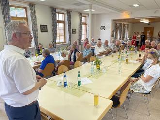 Im Bürgerhaus, der einstigen Schule, gab es dann noch reichlich Gelegenheit, sich über die vielen interessanten Geschichten des Ortes auszutauschen, bei Getränken und einem Essen, das die Frau des Bürgermeisters zubereitet hatte. Landrat Rainer Guth freute sich ebenso wie die Teilnehmerinnen und Teilnehmer, dass die „liebgewordene Tradition“ des „Treffpunkts Donnersbergkreis“ endlich fortgesetzt werden konnte, „das wurd‘ jetzt echt Zeit“. Dass wieder einige dabei waren, zeige, dass die Donnersberger zusammenstehen und trotz der Corona-Pandemie wieder zusammenkommen. Jakobsweiler sei ein Kleinod und ein typisches Dorf für die Donnersberger Region, das prosperiere. Mit dem Puppenstubenmuseum gebe es hier auch eines der best besuchten Museen im Landkreis. Er freue sich, mal wieder in Joxwiller zu sein, wie die Einheimischen den Ort nennen. Sein Fahrer, erzählte der Landrat schmunzelnd, habe bei seiner ersten Fahrt hierher vor vielen Jahren verzweifelt das Dorf auf der Landkarte gesucht, denn ein Joxwiller sei einfach nicht zu finden gewesen. Hier sei es einfach schön. Und wer sich hier nicht wohlfühle, werde es wohl nirgendwo tun.
