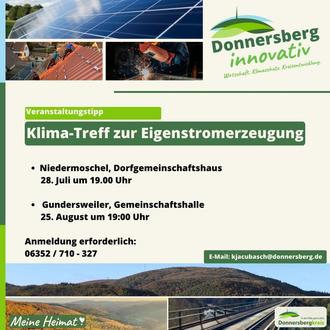 Das Klimaschutzmanagement des Donnersbergkreises lädt am Donnerstag, 28. Juli, um 19 Uhr zu einem Klima-Treff im Dorfgemeinschaftshaus in Niedermoschel ein. Die Veranstaltung soll über Rahmenbedingungen und Voraussetzungen für die Eigenstromerzeugung informieren, sowie auf Vorteile von Photovoltaik aufmerksam machen. Darunter fällt unter anderem, welche Gegebenheiten ein Dach erfüllen muss, um für eine Photovoltaikanlage in Frage zu kommen. Des Weiteren werden Themen wie Fördermittel und Finanzierungsmöglichkeiten besprochen, auch für die Beantwortung von Bürgerfragen wird Raum geboten. Ein weiterer Klima-Treff wird am Donnerstag, 25. August, in der Gemeinschaftshalle Gundersweiler um 19 Uhr angeboten.