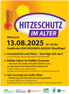 Die Sommer werden immer heißer – besonders für ältere Menschen stellen hohe Temperaturen ein zunehmendes Gesundheitsrisiko dar. Umso wichtiger ist es, über Schutzmaßnahmen aufzuklären und zu informieren. Am Mittwoch, den 13. August 2025, findet deshalb von 14.00 Uhr bis 18.00 Uhr eine Informationsveranstaltung in der Stadthalle Kirchheimbolanden/Westflügel statt. Der Eintritt ist frei. Eine Anmeldung ist nicht erforderlich.