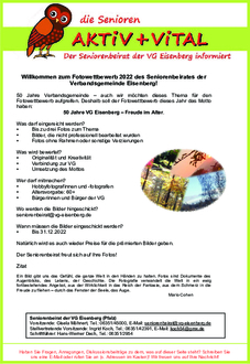 Willkommen zum Fotowettbewerb 2022 des Seniorenbeirates der Verbandsgemeinde Eisenberg! 50 Jahre Verbandsgemeinde – auch wir möchten dieses Thema für den Fotowettbewerb aufgreifen. Deshalb soll der Fotowettbewerb dieses Jahr das Motto haben: 50 Jahre VG Eisenberg – Freude im Alter. Was darf eingereicht werden? • Bis zu drei Fotos zum Thema • Bilder, die nicht professionell bearbeitet wurden • Fotos ohne Rahmen oder sonstige Verzierungen Was wird bewertet? • Originalität und Kreativität • Verbindung zur VG • Umsetzung des Mottos Wer darf mitmachen? • Hobbyfotografinnen und -fotografen • Altersvorgabe: 60+ • Bürgerinnen und Bürger der VG Wo werden die Bilder hingeschickt? seniorenbeirat@vg-eisenberg.de Wann müssen die Bilder eingeschickt werden? • Bis 31.12.2022 Natürlich wird es auch wieder Preise für die prämierten Bilder geben. Der Seniorenbeirat freut sich auf Ihre Fotos! Zitat Ein Bild gibt uns das Gefühl, die ganze Welt in den Händen zu halten. Fotos sind Dokumente des Augenblicks, des Lebens, der Geschichte. Die Fotografie verwandelt die Welt in ein ewig fortbestehendes Angebot, aus der Wirklichkeit in das Reich der Fantasie, aus dem Schmerz in die Freude zu fliehen – durch das Fenster der Seele, das Auge. Mario Cohen Seniorenbeirat der VG Eisenberg (Pfalz) Vorsitzende: Gisela Mähnert, Tel.: 06351/45000, E-Mail: seniorenbeirat@vg-eisenberg.de Stellvertretende Vorsitzende: Ingrid Koch, Tel.: 06351/42391, E-Mail: koch54@gmx.de Schriftführer: Hans-Werner Dech, Tel.: 06351/2954 Haben Sie Fragen, Anregungen, Diskussionsbeiträge zu dem, was auf dieser Seite steht? Schreiben Sie uns eine E-Mail oder rufen Sie an (s. Adressen im Kasten)! Wir freuen uns auf Ihre Nachricht!