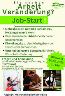 Job Start bietet Arbeitssuchenden einen Einblick, was Sie in den Berufsfeldern erwartet. So können Sie sich orientieren und beurteilen, was zu ihnen passt, was unserer Ansicht nach eine wichtige Voraussetzung für eine erfolgreiche Vermittlung ist. Job Start bietet eine gute Gelegenheit für einen ersten persönlichen Eindruck voneinander und vielleicht den Auftakt für ein weiteres Kennenlernen. Die letzten Jahre haben mit vielen Erfolgsgeschichten gezeigt: „Auch Menschen mit Migrationshintergrund können sich durchaus ins Arbeitsleben integrieren“. So bietet Job Start gerade den Menschen, die durch ihre Biografie den deutschen Arbeitsmarkt noch nicht kennen, eine tolle Chance für ihren Einstieg. Job Start ist jedoch ausdrücklich nicht auf Menschen mit Migrationshintergrund reduziert. Wer im Donnerbergkreis eine Arbeit sucht, ist eingeladen, dieses Angebot zu nutzen.