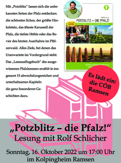 „Potzblitz - die Pfalz!“ ist das neue Buch des langjährigen RHEINPFALZ-Redakteurs Rolf Schlicher. Bei einer Lesung in der CÖB Ramsen, Klosterhof 7 am Sonntag, 16. Oktober 2022, 17 Uhr, stellt er diesen „ersten Überraschungsführer für die Pfalz“ vor.