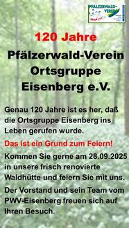 120 Jahre PWV-Eisenberg. Am 28.09.2025 feiern wir mit einem Hüttentag