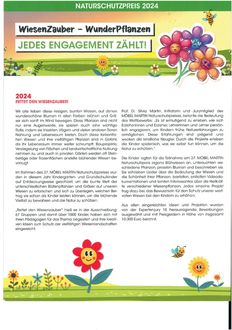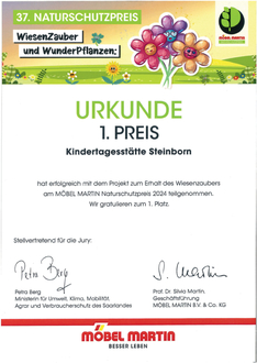 Zum Thema "Wiesenzauber - Wunderpflanzen" den 37. Naturschutzpreis von Möbel Martin hat die Kita Steinborn den 1. Preis gewonnen. Die feierliche Übergabe des Preises und die damit verbundene Summe von 1500,00€ konnten am Freitag, den 20.09.2024 die Leitung und drei weitere Erzieherinnnen in Saarbrücken in Empfang nehmen. Die Übergabe erfolgte durch die Geschäftsfüherin Frau Prof. Dr. Silvia Martin der Firma Möbel Martin und die Ministerin des Saarlandes für Umwelt, Klima, Mobilität, Agrar und Verbrauerschutz Frau Petra Berg.