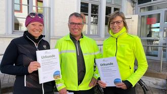 Zudem konnte Reiner Bauer noch zwei begeisterte Radfahrerinnen auszeichnen. Cathryn Meidlinger und Anke Corell-Grasser erhielten den Titel „Donnersberger Klimaheldinnen des Monats September“. Beide arbeiten in der Abteilung Bauen und Schulen der Kreisverwaltung, waren wie immer beim Stadtradeln sehr aktiv und bestreiten auch ihre Alltags- und Arbeitswege schon jahrelang mit dem Fahrrad.