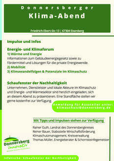 „Beim Donnersberger Klima-Abend in Eisenberg wollen wir diese und weitere Fragen erörtern, Lösungsmöglichkeiten aufgreifen und den Blick perspektivisch auf die zukünftige Energie- und Wärmeversorgung richten“, kündigt Reiner Bauer, Leiter der Stabsstelle Wirtschaftsförderung, Standortentwicklung und Klimaschutz der Kreisverwaltung Donnersbergkreis, an.
