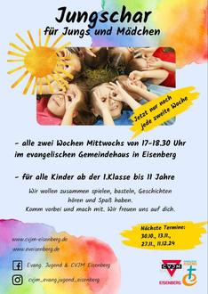 Evangelische Jugend & CVJM Eisenberg laden alle Kinder ab der 1. Klasse bis 11 Jahre herzlich ein zur Jungschar im Evangelischen Gemeindehaus in Eisenberg, alle zwei Wochen mittwochs von 17:00 Uhr bis 18:30 Uhr. Gemeinsam mit dem Jungschar-Team können die Kinder spielen, basteln, Geschichten hören und Spaß haben.