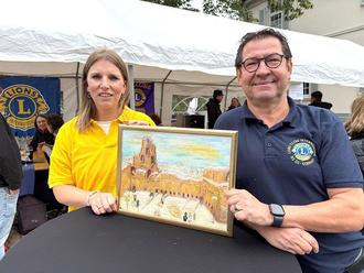 Bei dem Motiv des Kalenders handelt es sich dieses Mal um ein Gemälde der Monsheimer Künstlerin Roswitha Groß. [Es hängt hier als Kalendermotiv an. Alternativ steht ein Foto mit dem Bild der Künstlerin zur Verfügung, das von dem derzeitjgen Clubpräsidenten Axel Muhl und dem Clubmitglied Hannah Schumacher auf dem Lions-Stand in Eisenberg beim Autofreien Eistal präsentiert wird.]