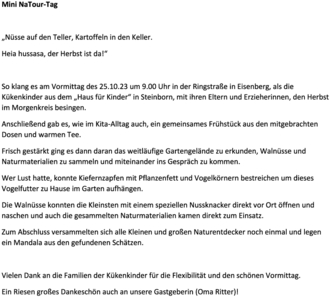 So klang es am Vormittag des 25.10.23 um 9.00 Uhr in der Ringstraße in Eisenberg, als die Kükenkinder aus dem „Haus für Kinder“ in Steinborn, mit ihren Eltern und Erzieherinnen, den Herbst im Morgenkreis besingen.