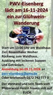 PWV Eisenberg lädt am 16.11.2024 zur Glühweinwanderung ein. Start am Waldhaus zum Schwefelbrunnen 13:00 Uhr.