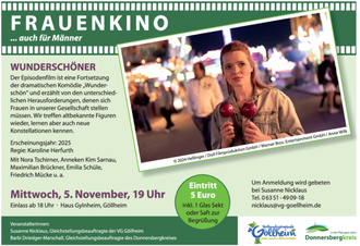 Am Mittwoch, dem 5. November, wird das Haus Gylnheim in Göllheim zum Kinosaal. Gezeigt wird der deutsche Spielfilm „Wunderschöner“ aus dem Jahr 2025, Fortsetzung des Erfolgsfilms „Wunderschön“ von und mit Karoline Herfurt.