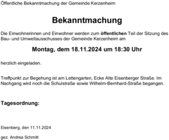 Die Einwohnerinnen und Einwohner werden zum öffentlichen Teil der Sitzung des Bau- und Umweltausschusses der Gemeinde Kerzenheim am