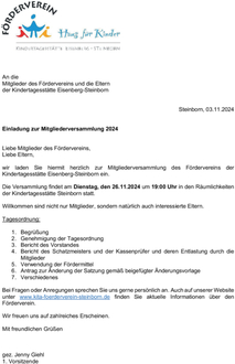wir laden Sie hiermit herzlich zur Mitgliederversammlung des Fördervereins der Kindertagesstätte Eisenberg-Steinborn ein.