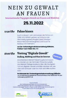 Auf Initiative der Gleichstellungsbeauftragten Barbi Driedger-Marschall (Donnersbergkreis) sowie Susanne Nicklaus (Verbandsgemeinde Göllheim) wird so an diesem Tag um 17.30 Uhr an der Verbandsgemeindeverwaltung in Göllheim die Fahne von „Terre des Femmes“ mit der Aufschrift „Frei leben ohne Gewalt“ gehisst.