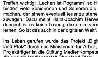 Die digitale Welt verspricht - gerade im Alter - einen großen Zugewinn an Lebensqualität, Selbstständigkeit und Teilhabe. Doch viele ältere Menschen kennen gar nicht die Chancen, die Internet, Smartphone und Co. im Alltag bieten. Oft verhindern große Berührungs-ängste den Einstieg. Wer nicht mitmacht, wird aber schnell abgehängt und verliert den Zugang zu vielen Bereichen des Alltagsgeschehens.