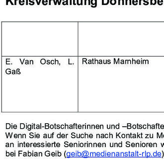 Die Veranstaltungen der Digital-Botschafterinnen und –Botschafter könnten unterschiedlicher nicht sein. Wichtig ist: Für jeden Erfahrungs- und Kenntnisstand im Umgang mit der digitalen Welt findet sich im Donnersbergkreis eine oder gleich mehrere passende Veranstaltungen der Digital-Botschafterinnen und –Botschafter. Ob größere oder kleinere Grup-pen, persönliche Betreuung, per Telefon oder Zoom, Einzeltermine zu Hause oder in Altenpflegeeinrichtungen. Alles ist möglich und kostenlos.