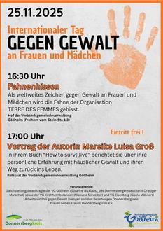 Am 25.11.2025 finden in Göllheim (Verbandsgemeindeverwaltung Göllheim, Freiherr-vom-Stein-Str. 1-3) zwei Programmpunkte rund um den Internationalen Tag gegen Gewalt an Frauen und Mädchen statt: